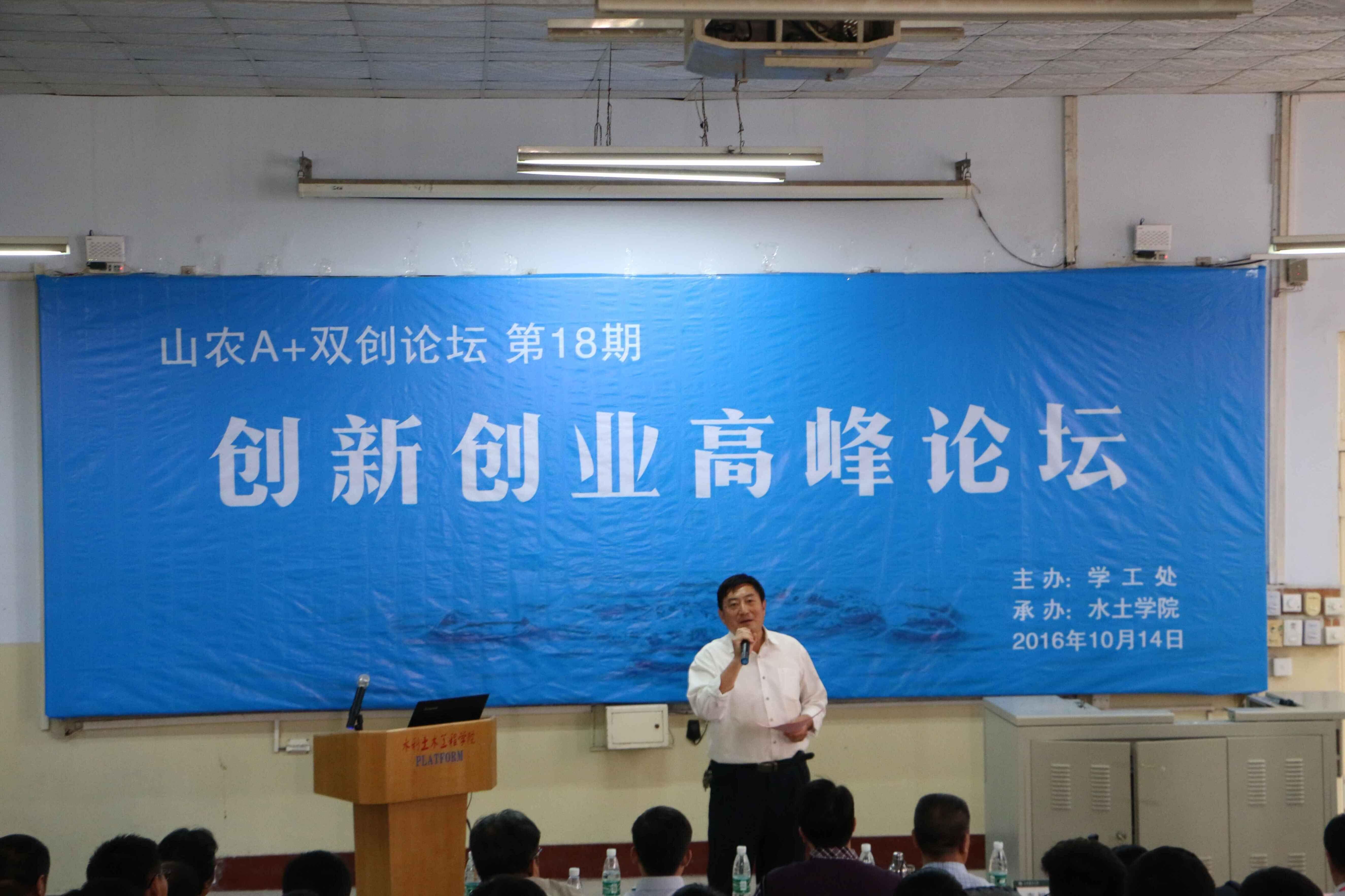 10月14日下午,由水土学院承办的山东水利论坛之创新创业分论坛在本部教学楼5s106拉开帷幕,日照万基集团董事长徐群德、山东新汇集团董事长刁峰、山东弘阳集团有限公司董事长郭宝义、华夏天农(北京)农业科技有限公司总经理王平应邀出席此次双创论坛,论坛由学院党委书记李树枫主持。
