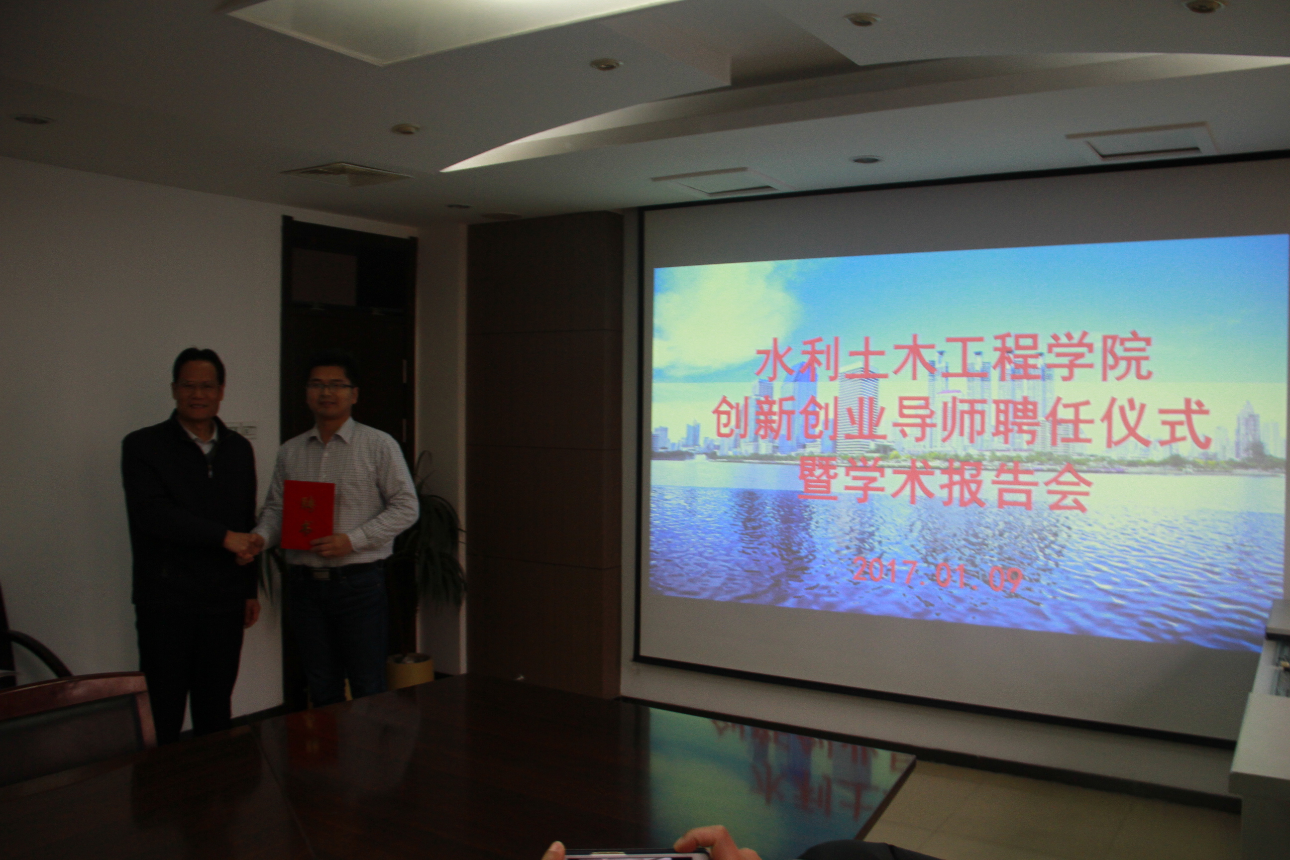 水土学院创新创业导师聘任仪式暨学术报告会于2017年1月9日下午在水土学院学术报告厅举行。院长刘传孝教授为尹世洋博士颁发创新创业导师聘书,尹世洋作学术报告。