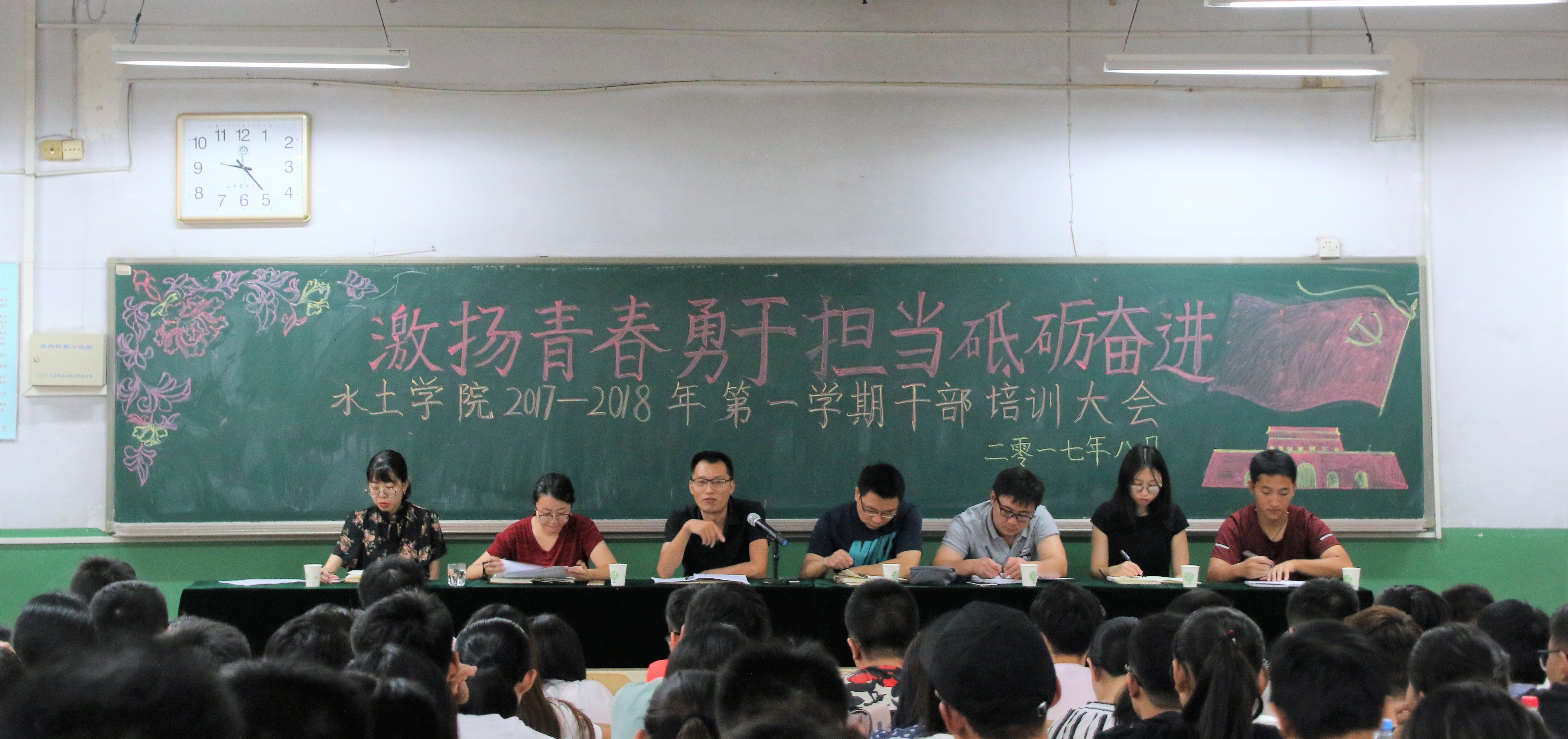 8月26日上午,水土学院2017-2018年第一学期学生干部培训大会于北校区12号楼111室召开。学院团委书记杜洪涛、各年级辅导员老师、学生干部及党员参加了本次培训大会。