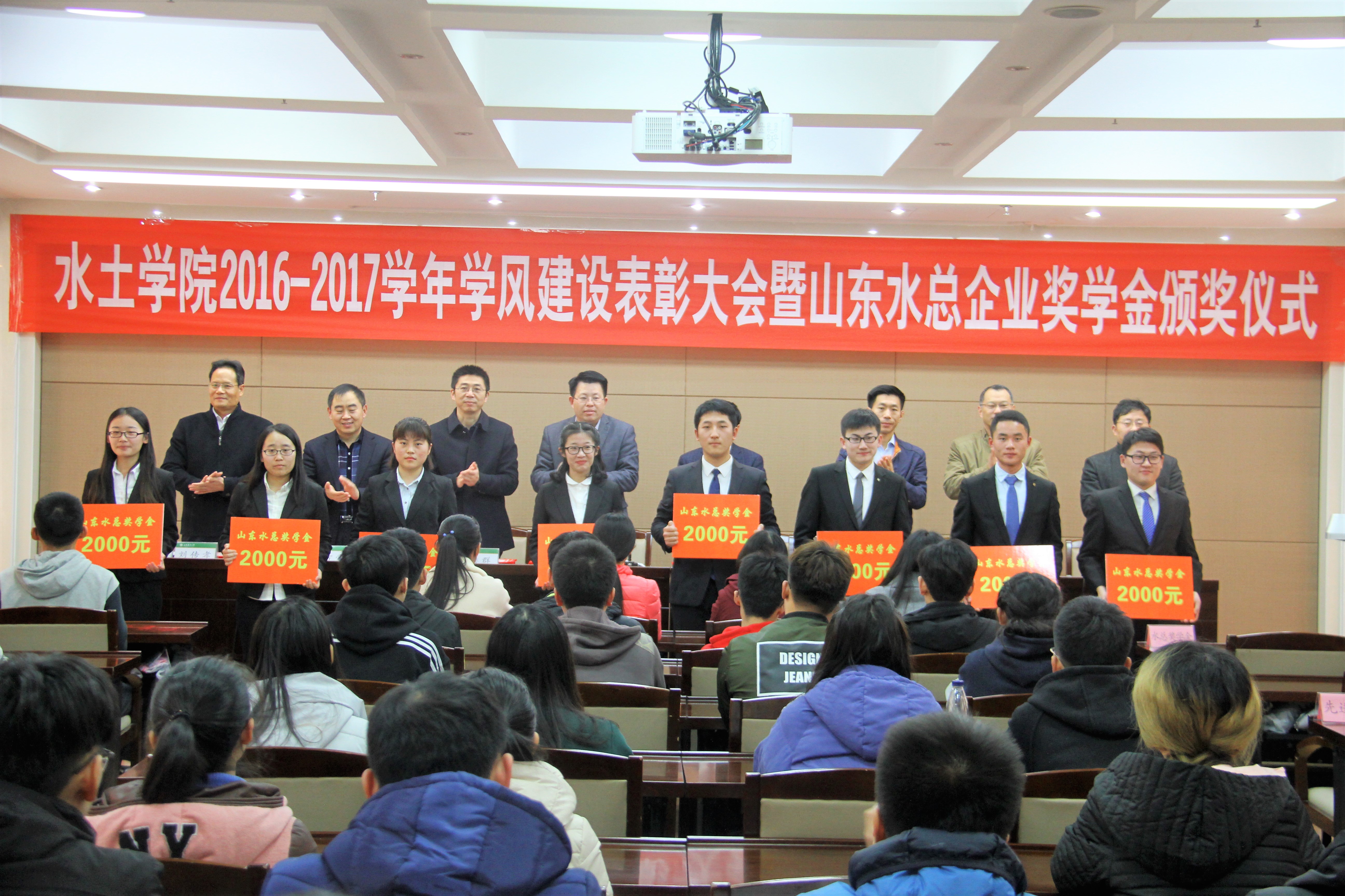大会颁发了山东水总奖学金,并表彰了2016年度优良学风班级和宿舍、先进个人以及学习标兵,获奖学生代表发言。