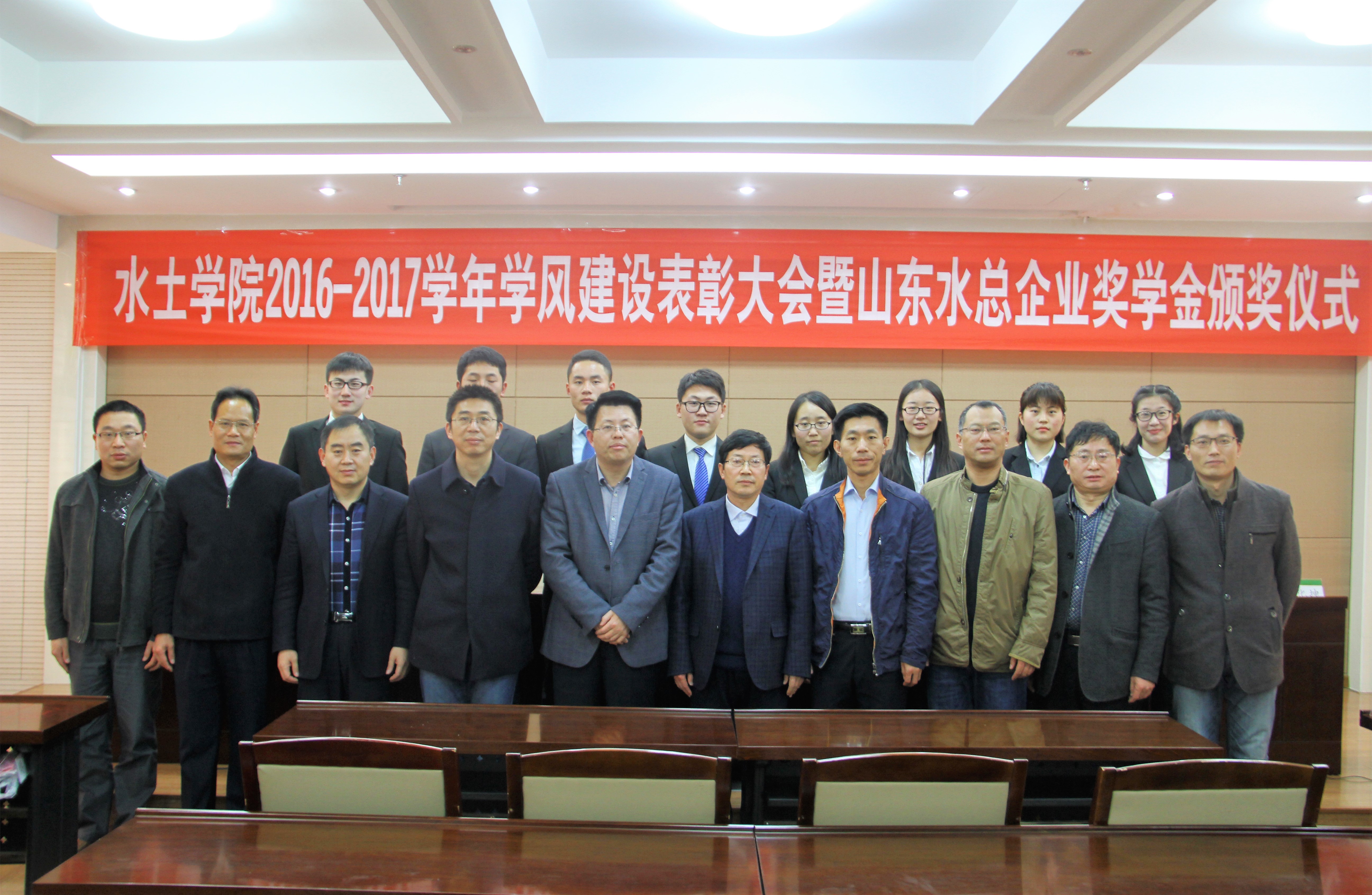 11月29日下午,“水土学院2016-2017学年学风建设表彰大会暨山东水总企业奖学金颁发仪式”于北校区学实楼隆重举行。学校党委副书记杨天梅、山东水总有限公司总经理周守家出席仪式并为获奖学生颁奖。院党委书记胡化坤主持会议。