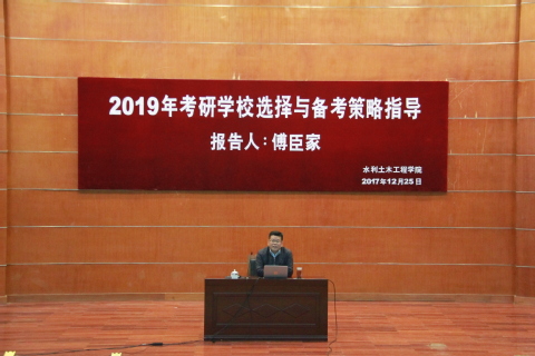 为给我校立志考研的同学们提供更多的指导,水土学院于12月25日晚在文理大楼学术报告厅举办“2019年考研学校选择与备考策略指导”专题讲座。院党委副书记傅臣家作为主讲人,学工处处长王群、水土学院辅导员老师及各学院2015级三百余名学生参加了本次讲座。