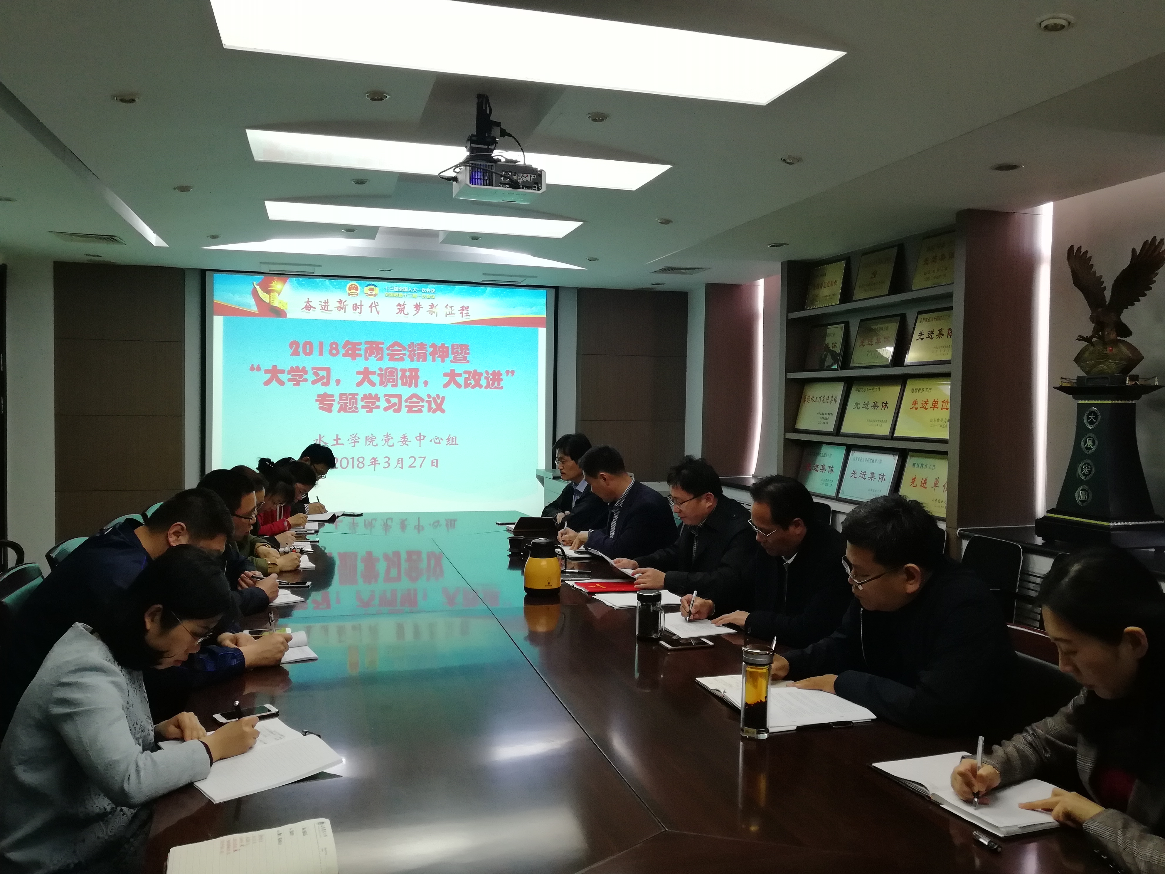 3月27日下午,院党委中心组在11号楼213会议室召开会议,学习习近平同志在第十三届全国人民代表大会第一次会议上的讲话精神等内容,学院党委委员及班子成员和支部书记参加了会议,胡化坤同志主持了会议。