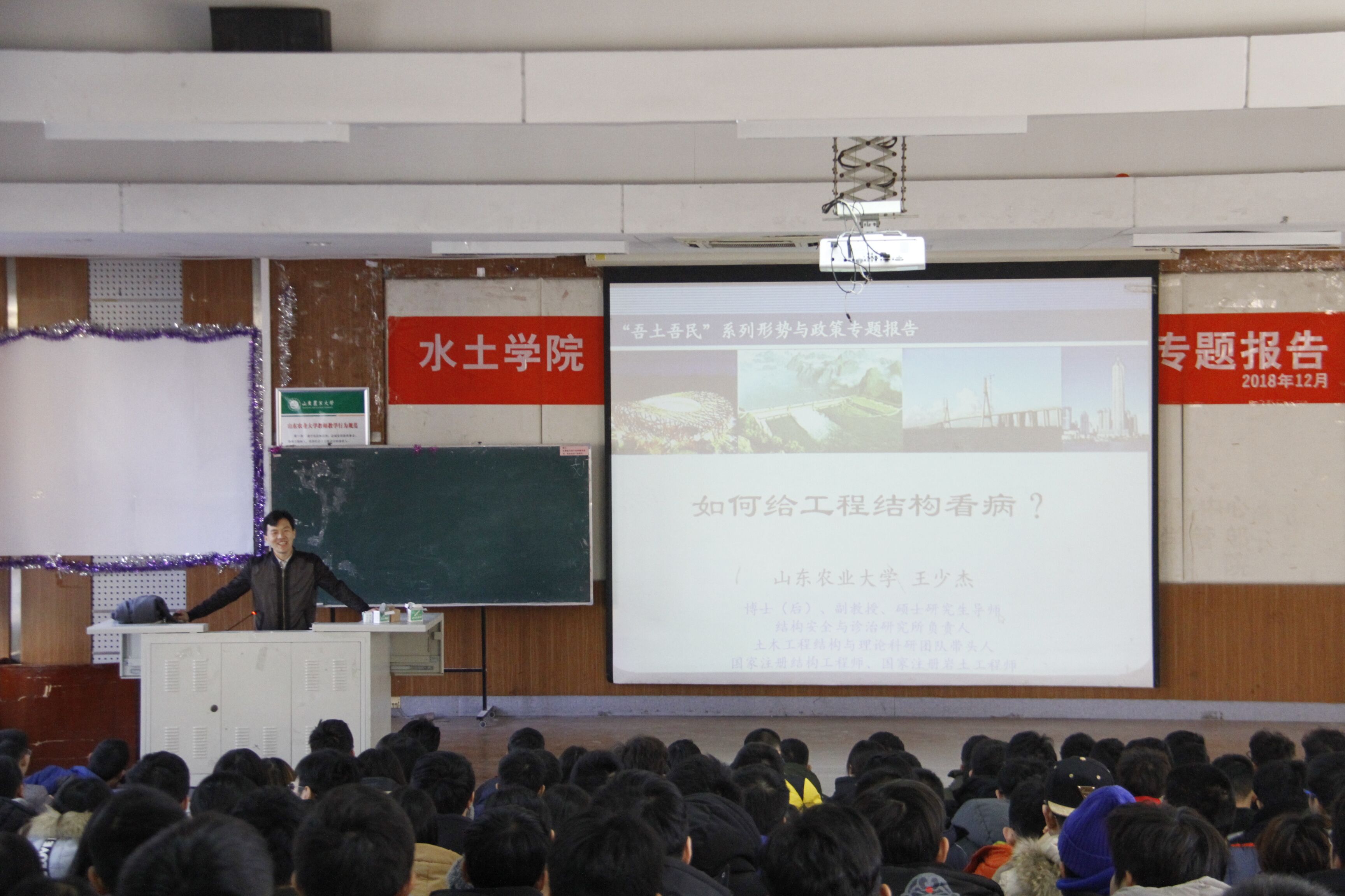 12月28日下午,水土学院王少杰老师于东校区教学楼217为同学们开展以“如何给工程结构看病”为主题的吾士吾民系列形式与政策专题报告会。我院相关专业400余名学生聆听了本次报告。
