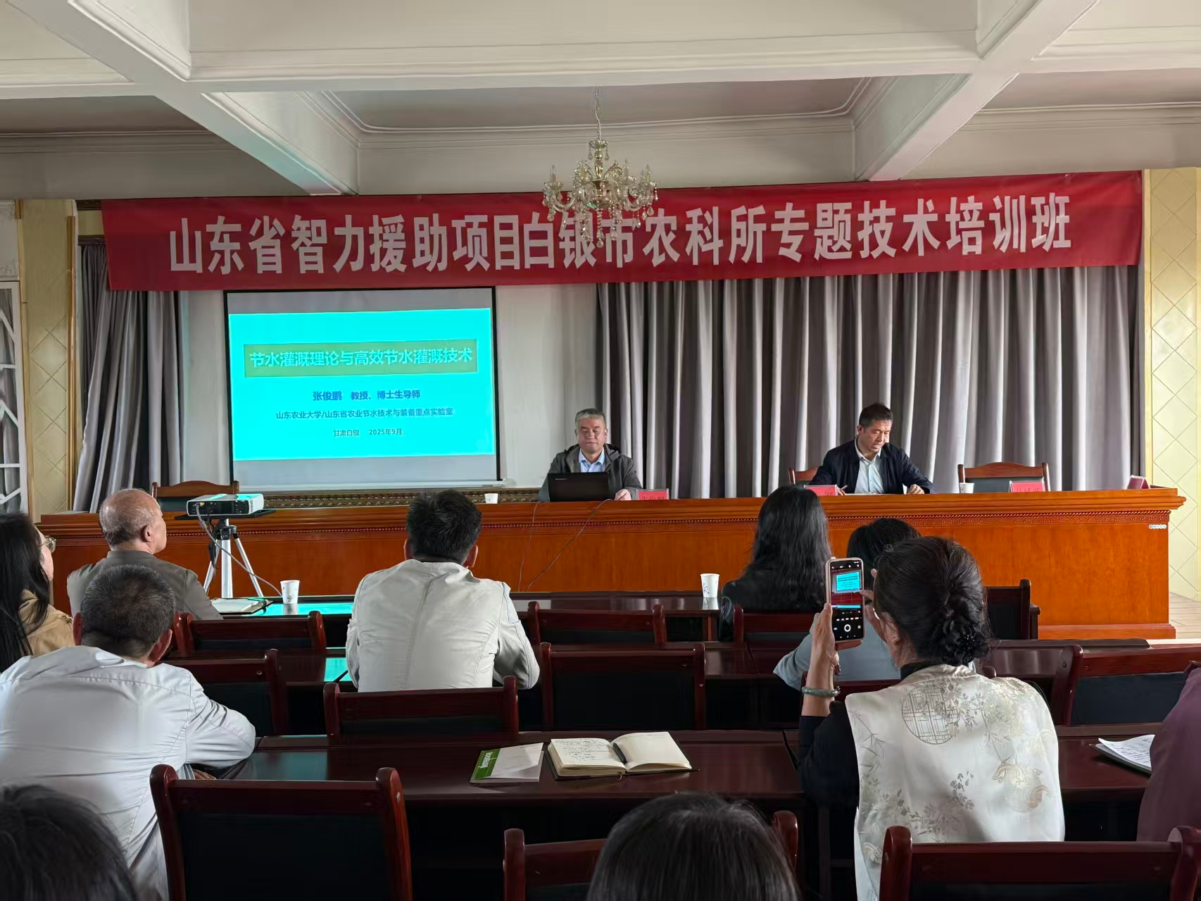 专家团分别赴白银市、景泰县、平川区,围绕节水灌溉、循环农业等内容进行专题培训。张俊鹏教授在白银市农业科学研究所开展了“节水灌溉理论与高效节水技术”专题培训,系统讲授了节水灌溉理论基础、作物需水量与灌溉用水量、节水高效灌溉制度,介绍了微灌技术和喷灌技术的典型应用案例,分享了团队在微咸水安全利用、麦玉周年水肥高效利用、滴灌水肥气协同调控等方面的最新研究成果。培训结束后,张俊鹏教授与白银市科学技术局主要领导、市农科所领导班子及部分科研人员围绕平台共建、项目申报、技术成果转化、人才培养等合作方向展开深入探讨,为后续产学研协同发展奠定基础。