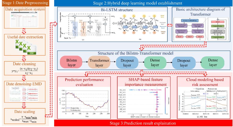 在智能大坝健康监测领域,准确且可解释的变形预测仍是关键挑战。为突破现有深度学习模型在泛化能力和决策透明度方面的局限,本研究提出一种新型混合深度学习框架。该框架深度融合了捕捉全局依赖关系的Transformer架构与建模局部时序动态的双向长短期记忆网络,从而显著提升预测精度与泛化能力。此外,我们融合夏普利加性解释与云模型,构建了集“预测-归因-评估”于一体的完整流程。在中国宁夏黄河干流水工枢纽的案例研究中,所开发的六种变形预测模型均表现优异:均方误差低于0.029,均方根误差低于0.137,显著优于其他三种广泛应用的坝体变形预测深度学习模型。夏普利加性解释识别出五个关键风险影响因子,包括前时段变形量与坝基接缝张开位移等。云模型进一步实现了动态风险演变的定量评估。本研究推动大坝安全监测范式从“黑箱预测”向“透明决策”转变,为实时风险管理提供了兼具理论与实践价值的解决方案。
