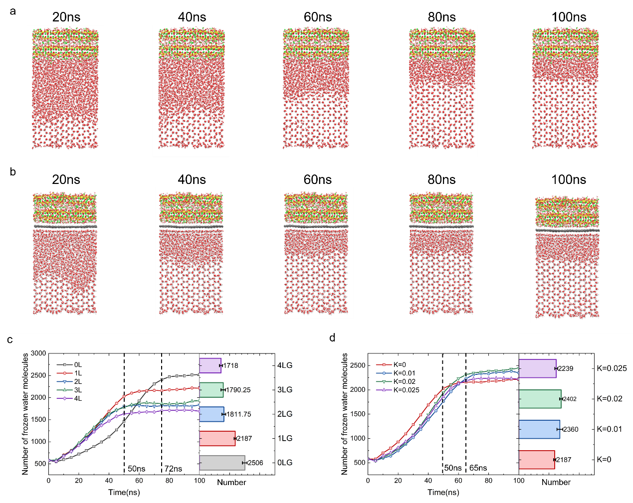 图1 冻结快照及冻结水分子数量随时间演化情况
