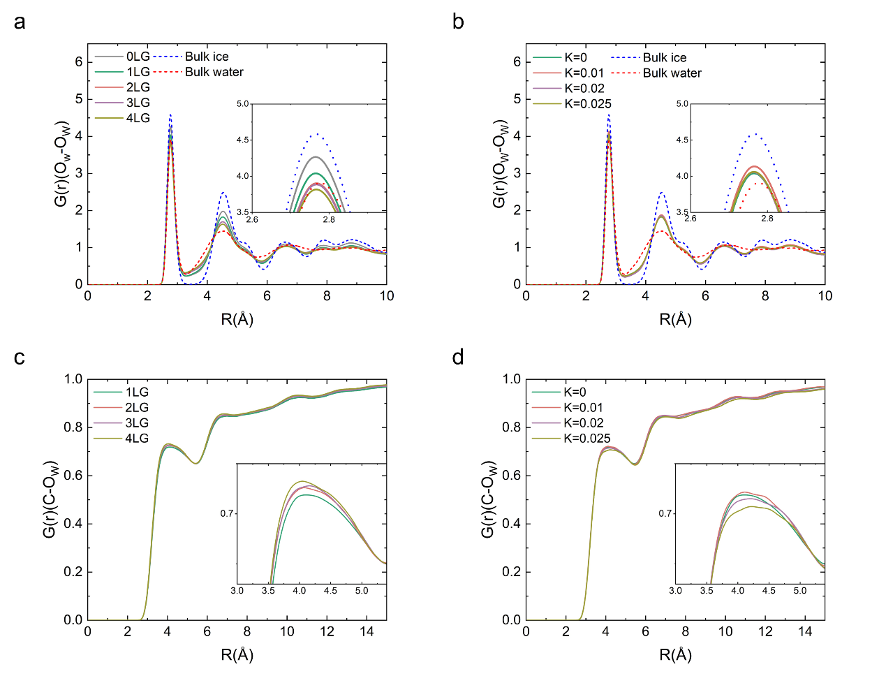 图表 1a和b分别展示了不同石墨烯层和曲率的复合系统中未冻结水膜中氧-氧的RDF。c和d分别显示了不同石墨烯层和曲率的复合系统中碳与氧之间的RDF。对于多层石墨烯复合系统,统计基于最接近水分子的石墨烯层作为参考原子。