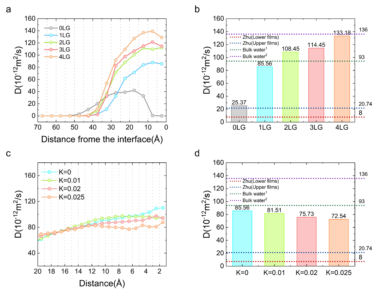 图表 3a在不同石墨烯层数的系统中,水分子在0参考平面不同距离处的扩散系数。b不同石墨烯层数系统中未冻结水层的扩散系数。c不同曲率石墨烯系统中不同位置水分子的扩散系数。d不同石墨烯曲率系统中未冻结水层的扩散系数。