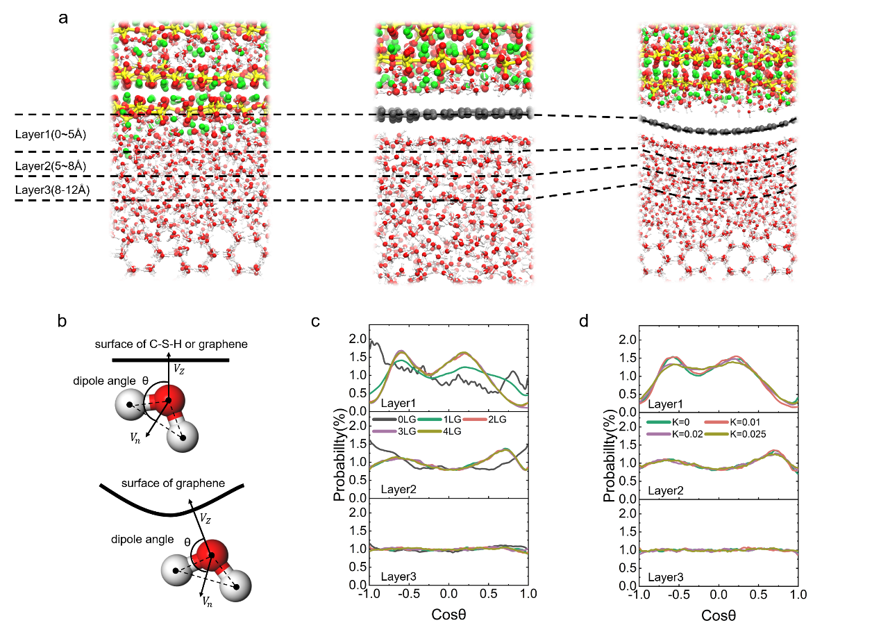 图表 2a不同系统水层的定义,其中Si-O链作为C-S-H系统的零参考平面,石墨烯作为石墨烯添加系统的零参考平面。b定义水分子偶极矩与表面法线之间的夹角。c和d分别展示了复合系统中不同水层中水分子偶极角余弦的分布。