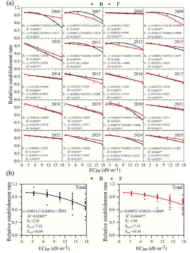 在棉花咸水适宜灌溉方式与盐分阈值研究方面,针对咸水灌溉对土壤盐分的影响具有持续性以及棉花萌发出苗和幼苗生长阶段耐盐性较弱的问题,论文“Effects of Long-Term Saline Water Irrigation on Cotton Emergence and Seedling Growth”基于长达20年(2006-2025)的定位试验,系统探究了不同矿化度咸水畦灌和沟灌对棉花成苗与幼苗生长及土壤水盐动态的影响。研究发现,适量浓度的咸水灌溉对土壤水盐和棉花出苗无明显影响,但连续多年采用≥10.6 dS·m⁻1咸水灌溉,棉花成苗率的稳定性与可持续性下降;能够保障根区土壤盐分周年动态平衡、棉花成苗率不受显著抑制的灌溉水矿化度阈值为10.0 dS·m⁻1(畦灌)和10.4 dS·m⁻1(沟灌);当灌溉水盐度≤8.3 dS·m⁻1时,畦灌更利于棉花成苗和幼苗生长,反之,沟灌更为有利。该论文第一单位为山东农业大学水利土木工程学院/山东省农业节水技术与装备重点实验室,第一作者为2023级硕士研究生谢运超,通讯作者为张俊鹏教授和张安琪博士,河北省农林科学院旱作农业研究所党红凯研究员等参与核心研究。