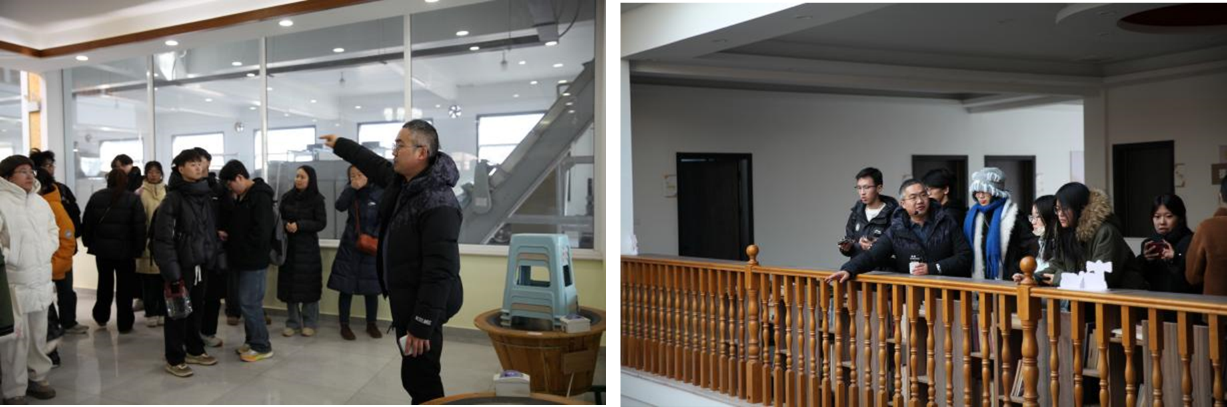 下午,调研队伍来到以茶闻名的小津口村。在津口女儿茶综合楼,村党支部书记李金山系统讲解了该村通过“党支部+合作社+农户”模式,推动茶产业标准化、品牌化、生态化发展的具体举措。同学们结合专业所学,重点考察了综合楼内制茶工艺的生产流线组织与建筑设计之间的有机结合,直观认识了空间设计如何有效服务于乡村特色产业发展。
