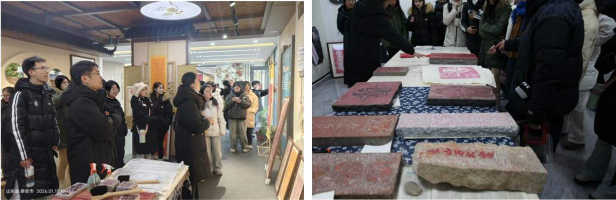 最后一站是白马石村。师生们深入村级党群活动中心,学习基层治理的创新成果;并在非遗拓片工坊中,亲手体验传统拓片技艺的制作流程,近距离感受泰山文化的深厚底蕴与独特魅力,深刻理解了文化传承在乡村振兴中的重要作用。
