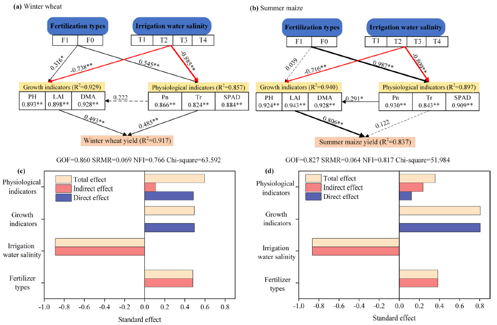 华北平原淡水资源短缺,安全高效利用咸水灌溉是维持农业生产可持续发展的重要途径之一。然而,长期咸水灌溉对土壤环境和作物生长具有潜在危害。本研究基于长期定位试验,探究了咸水灌溉配施有机肥对冬小麦-夏玉米生长发育和产量形成的调控效应。研究发现,适量浓度的微咸水灌溉对冬小麦和夏玉米生长发育和籽粒产量无显著影响,但超过一定阈值会显著降低作物产量;与冬小麦相比,咸水灌溉对夏玉米的抑制作用更为明显。增施有机肥可有效缓解咸水灌溉对麦玉生长性状和光合性能的不利影响,并通过不同机制提高籽粒产量。有机肥通过对冬小麦生长和生理指标的双重调节来提高产量,对耐盐性较弱的夏玉米,则通过提高光合性能调节生长来提高产量。