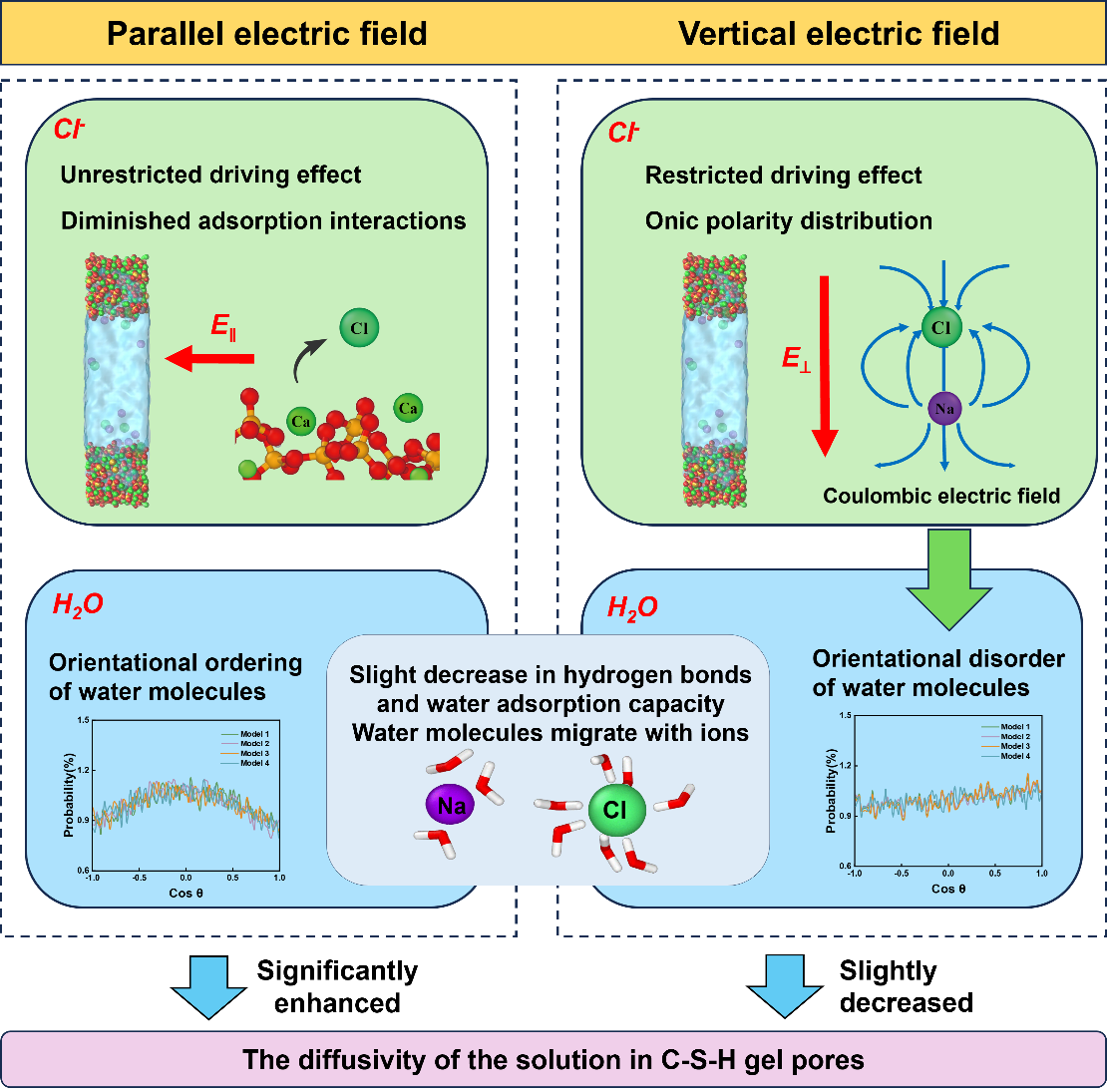 近日,水利土木工程学院尹航副教授团队在期刊《Journal of Building Engineering》发表题为“Ion and Water Migration in C-S-H Nanopores under External Electric Fields: Effects of Field Orientation, Concentration, and Structural Heterogeneity”的研究论文。水利土木工程学院2023级硕士研究生王世杰为论文第一作者,尹航副教授为论文通讯作者,山东农业大学为第一通讯单位。